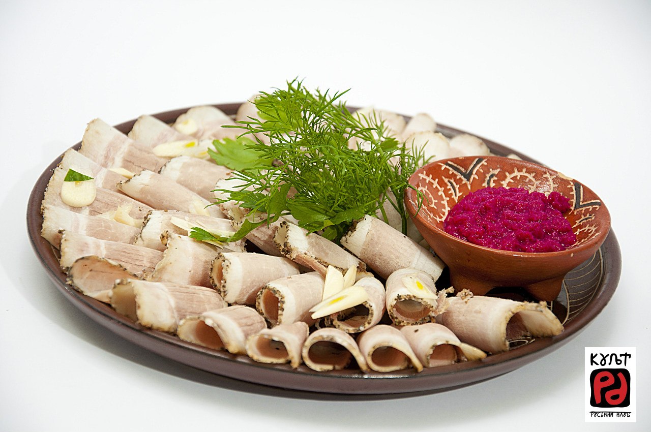 Коментар для «День Незалежності Русі-України разом з Руським клубом «Культ РА»! - І звісно ж, радимо Вам скуштувати «Нарізочку із сала за батьковим рецептом» (150/30 г, 67 грн). Це запечена підчеревина з білими грибами, яка подається з часничком, зеленню та запашним хріном.»