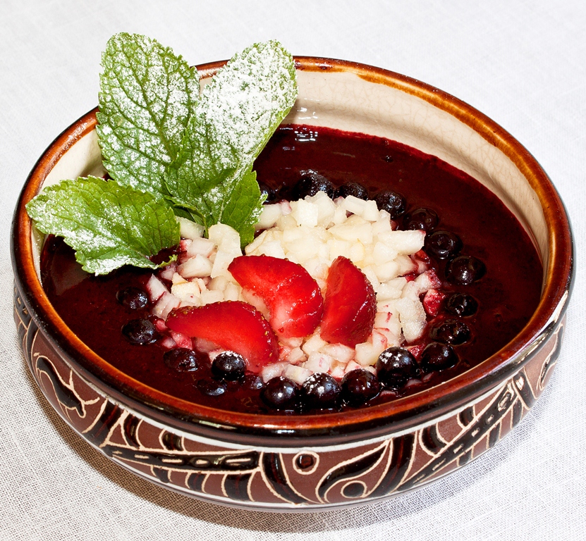 Фірмовий ягідний супчик (250 г, 69 грн) - дбайливо перетерті ягідки полуниці та чорниці, з подрібненим яблуком, запашною смородиною та смужками полуниці, що просто тануть в роті!