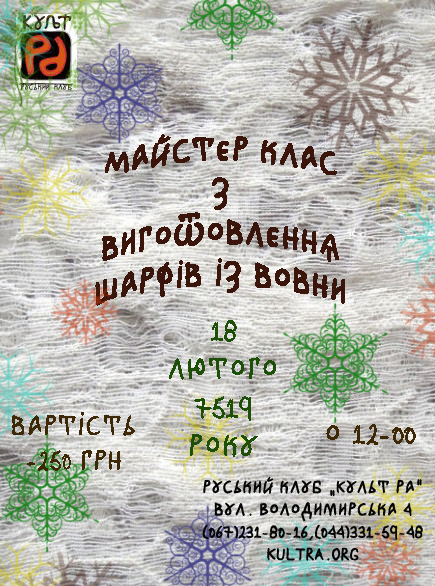 Руський клуб «Культ Ра» дарує всім чудову можливість не тільки насолодитись цим магічним дійством, але й самому на один день стати справжнім майстром і виготовити для себе чи близьких оригінальний, теплий та вишуканий шарф. Справжній майстер та знавець своєї справи 18.02.2012 р. 0 12.00 проведе майстер-клас з валяння шарфу з вовни. Всі матимуть унікальну можливість навчитися цій потрібній у буденному житті справі. І хай не лякає Вас вартість входу на цю подію, що становитиме 250 грн., оскільки в магазині купити такий шарф обійдеться набагато дорожче і не завжди цей продукт буде високоякісним. Все, що Ви виготовите власними руками на майстер-класі, матимете можливість забрати з собою, та передати безцінний досвід рідним чи близьким.