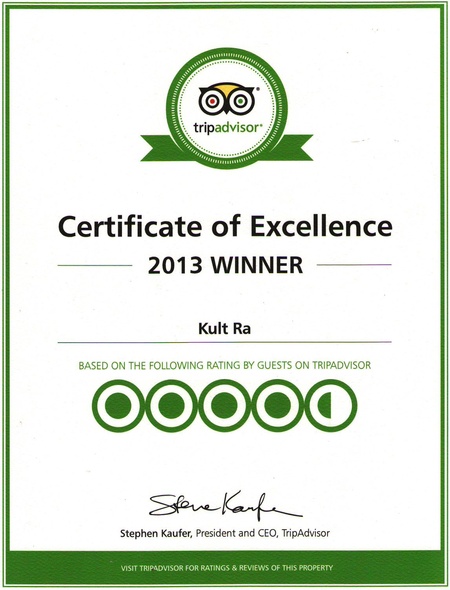 Завдяки піклуванню про кожного гостя та результатам користувацьких відгуків найбільшого в світі сайту про подорожі – www.tripadvisor.com, Руський клуб «Культ Ра» отримав відмінну оцінку серед відвідувачів та нагороджений «Сертифікатом відмінності»! Також заклад увійшов до 15-ки найкращих ресторанів з 550-ти розташованих у місті Києві!