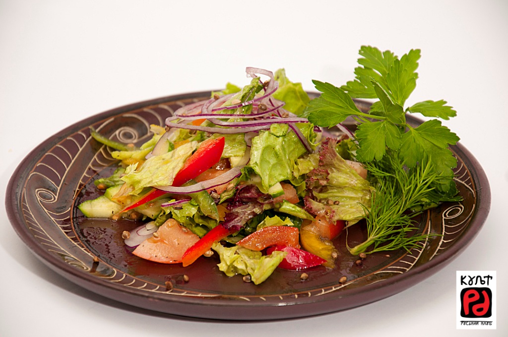 САЛАТ ЗІ СВІЖИХ ОВОЧІВ З ГОРІХАМИ ТА ВИНОГРАДОМ (200/30 г, 75 грн). Легенький салат зі свіжих органічних овочів. Стиглі помідори, огірки, болгарський перець , зелений салат, кримську червону цибульку Можемо заправити конопляною олією, соняшниковою олією та домашньою сметанкою до вашого смаку.