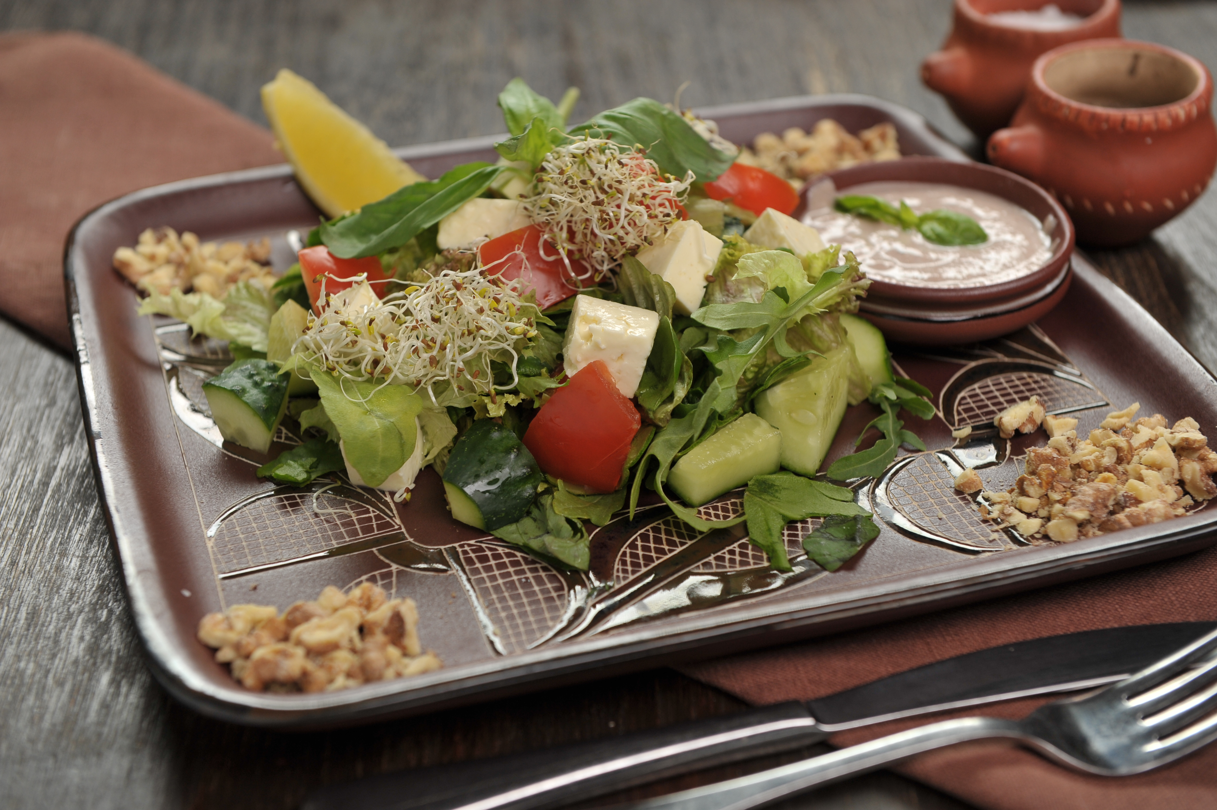 Коментар для «ВИШУКАНІ САЛАТИ - ВОЛОСЬКИЙ САЛАТ ІЗ БРИНЗОЮ "СКРИПКА" (220/60/40 г. 120 грн.) Свіжі огірочки з помідорчиками змішані з кубиками домашньої бринзи та зеленню різноманітною. Заправлене все олійкою і горіховою мочанкою.»
