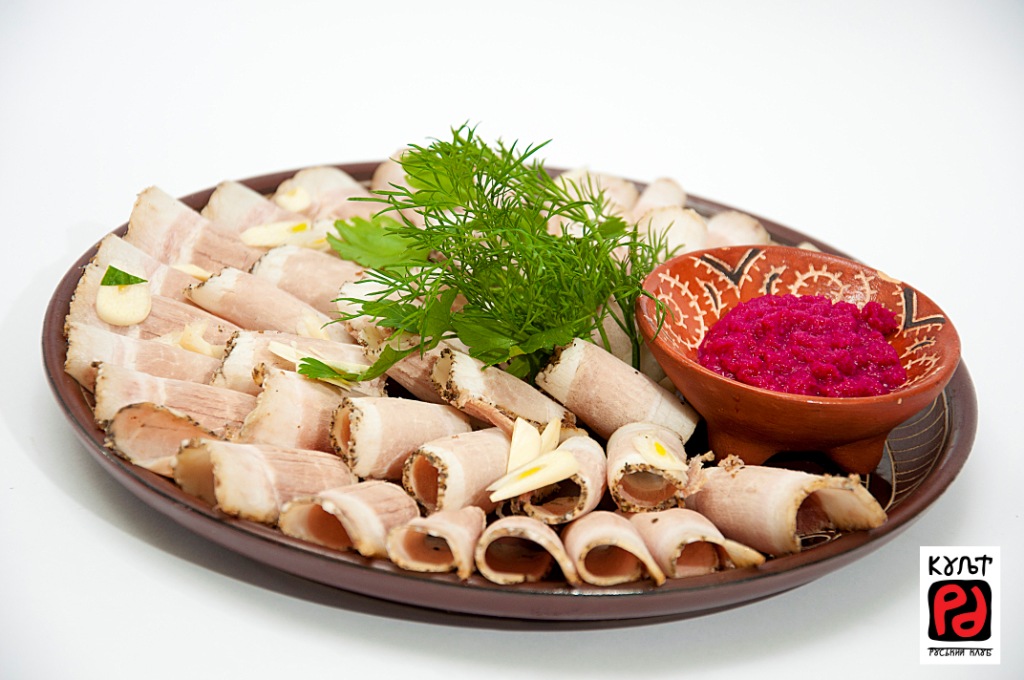 НАРІЗОЧКА ІЗ САЛА ЗА БАТЬКОВИМ РЕЦЕПТОМ (150/30 г, 76 грн). Домашнє сало, що маринується в імбирному соці, а потім доходить на пару. Подаємо з домашнім хріном та часником.