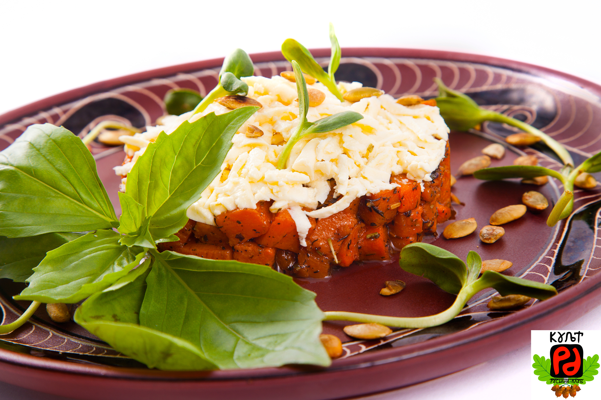ГАРБУЗ ЗАПЕЧЕНИЙ З БРИНЗОЮ (200/20 г. 54 грн.) Соковитий сонячний гарбуз було запечено, кубиками порізано і домашньою бринзою приправлено. Все що б Вам смакувало.