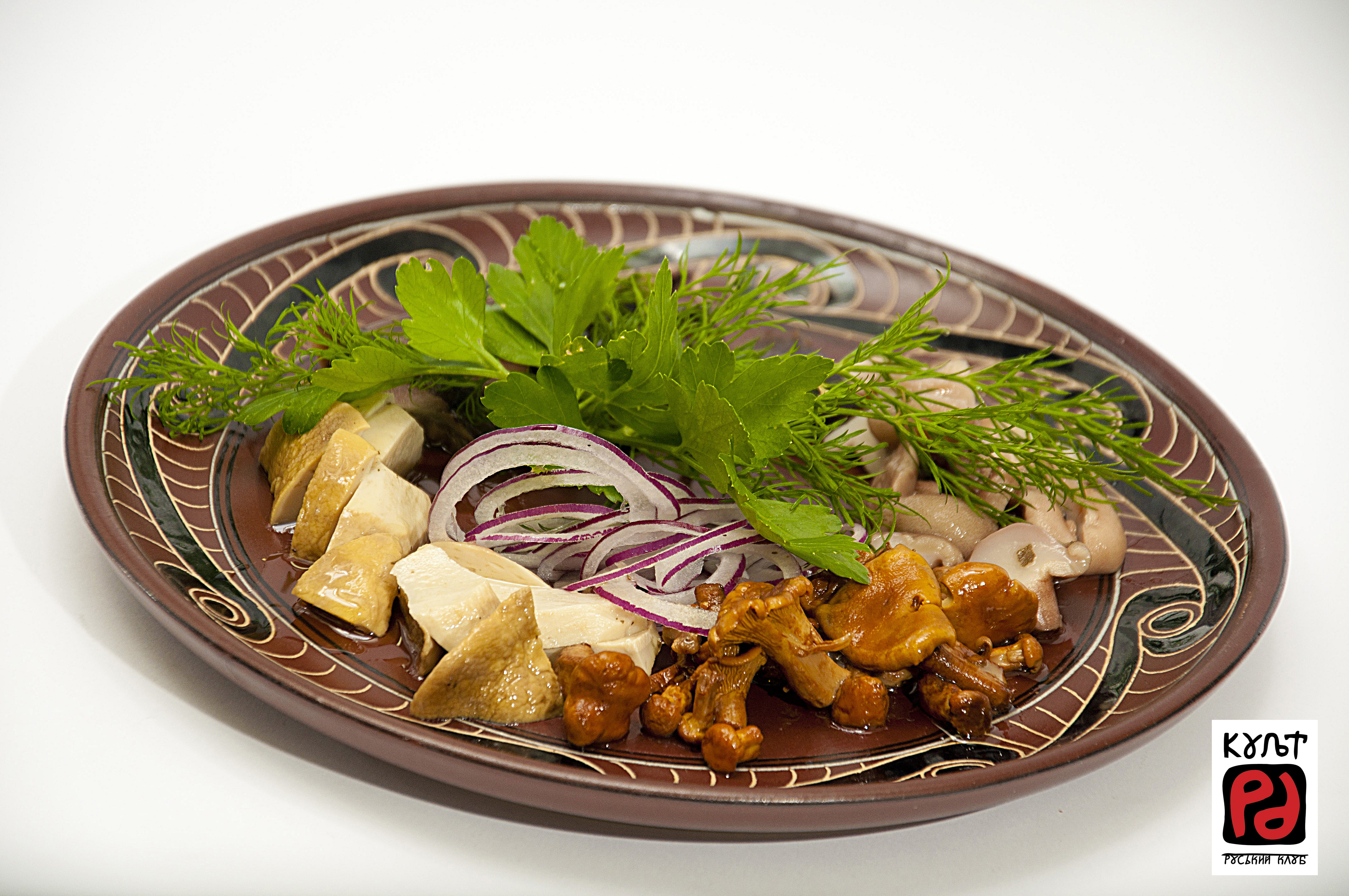 АСОРТІ З МАРИНОВАНИХ ГРИБОЧКІВ (140 г. 68 грн.) Тарілочка з українськими маринованими власноруч грибочками. Грузді, лисички, білі грибочки і маслюки щедро приправлені цибулькою та зеленню.