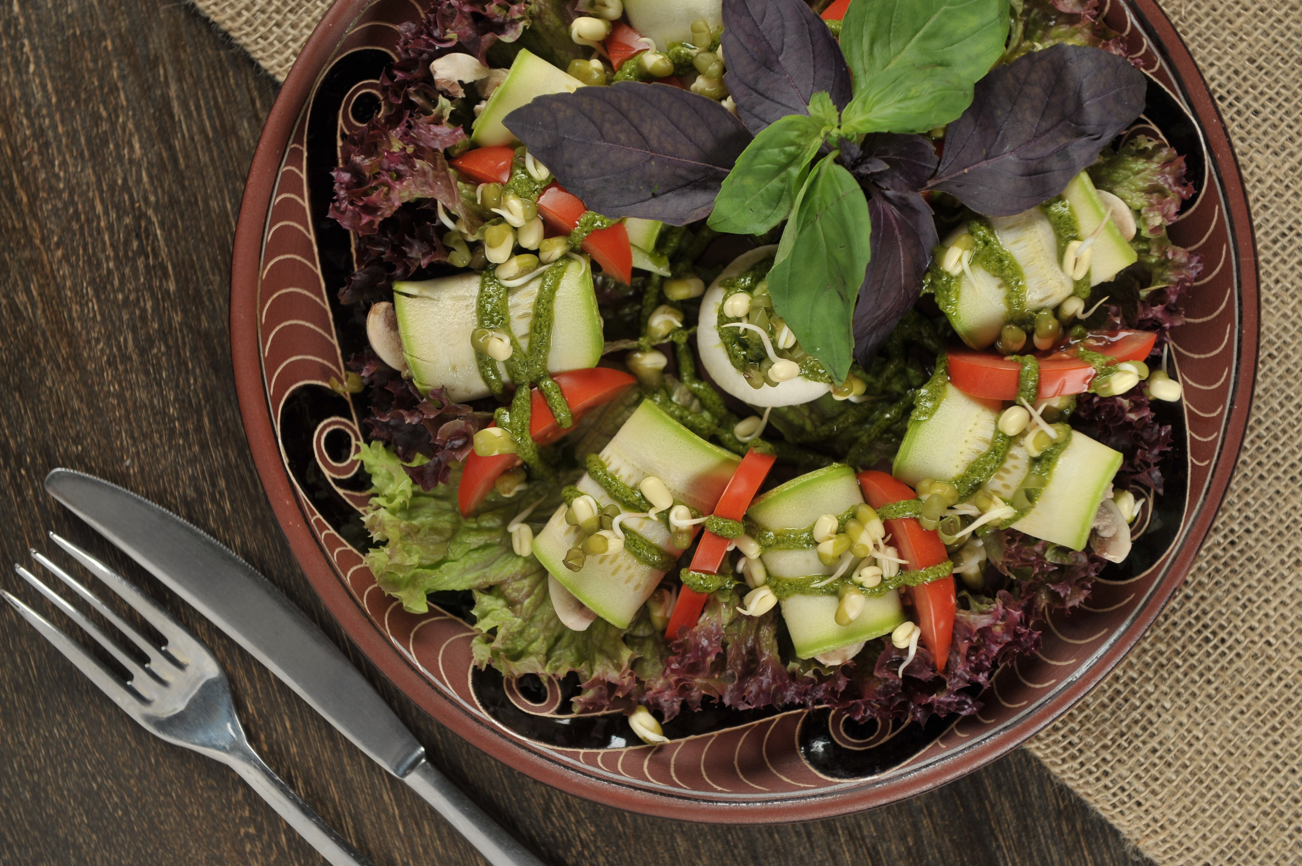 ЗЕЛЕНА ФАНТАЗІЯ (180 г. 70 грн.) Неймовірна страва - горіховий сир з печерицями, загорнений у тонкі смужки кабачка з пророщеними бобами.