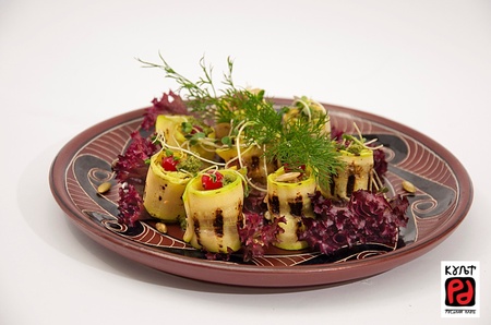 ЗАВИВАНЦІ КАБАЧКОВІ (150/20 г, 89 грн) з перетертими горіхами та прянощами. Тонко нарізаний кабачок, всередину якого загортаються перетерті з прянощами волоські горішки. Ягудки журавлини додадуть приємної кислинки.
